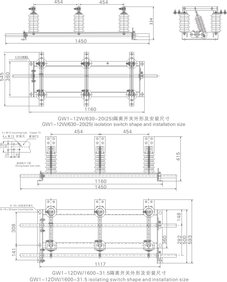 GW1-12 series outdoor high-voltage AC isolating switch (hereinafter referred to as “isolation switch”), suitable for installation on outdoor high-voltage power distribution equipment line, for 10kV line to be connected under voltage and no load, and for high voltage to be overhauled Electrical equipment such as busbars and circuit breakers can be electrically isolated from live high-voltage lines, and can also be used to separate small capacitive currents and inductor currents. The isolating switch is a double-column vertical open type with manual or electric mechanism for three-phase linkage. The isolating switch complies with GB 1985-2014 "High Voltage AC Isolation Switch and Grounding Switch", DL/T 486-2010 "High Voltage AC Isolation Switch and Grounding Switch" and other technical standards.